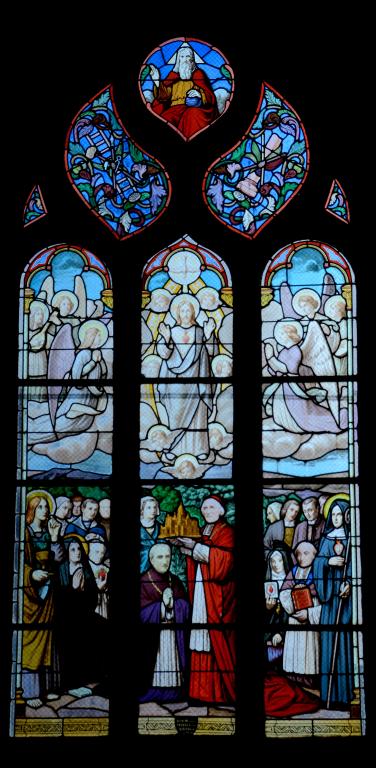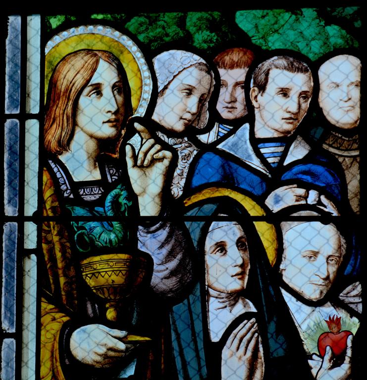Le réalisme des portraits atteste de l’utilisation de photographies dans les ateliers de verriers. Une assemblée de paroissiens assiste à l’offrande de la basilique du Sacré-Cœur de Montmartre par l’archevêque de Paris, le cardinal Guibert (1802-1886). Agenouillé, sans doute l’évêque de Quimper monseigneur Dubillard, nommé en 1899. A gauche de la scène, saint Jean l’évangéliste tient le calice d’où sort le dragon vaincu par la foi. Les autres personnages représentent vraisemblablement, à droite, le donateur Barthélémy Le Dréau (1820- 1900), maire d’Esquibien de 1856 à 1871 et de 1874 à 1876, accompagné de son gendre Jean-Marie Riou, trésorier de la fabrique, originaire du hameau de Kerneyen. Au centre son épouse, Marie Briant de Trobay. Les deux autres religieux agenouillés sont sans doute le recteur Couic (nommé en 1891) et le vicaire Perrot (nommé en 1897). Tous deux sont mentionnés dans l’inscription en bas de la composition, ainsi que Jean-Marie Riou. Difficile en revanche d’identifier les trois religieuses. Deux ont la tête nimbée et l’une tient une crosse d’abbesse. La sœur de Barthélémy Le Dréau était religieuse dans l’ordre du Saint-Cœur de Marie et celle de Jean-Marie Riou appartenait à la congrégation des filles du Saint-Esprit à Penvenan. On peut aussi penser à la Bienheureuse Marie du Divin-Cœur qui inspira l’encyclique de 1899 consacrant chaque homme au Sacré-Cœur, et Marguerite-Marie Alacoque (1647-1690) à l’origine du culte du Sacré-Cœur, béatifiée en 1864. (Elisabeth Loir-Mongazon - Culture et Patrimoine à Esquibien, 2020)