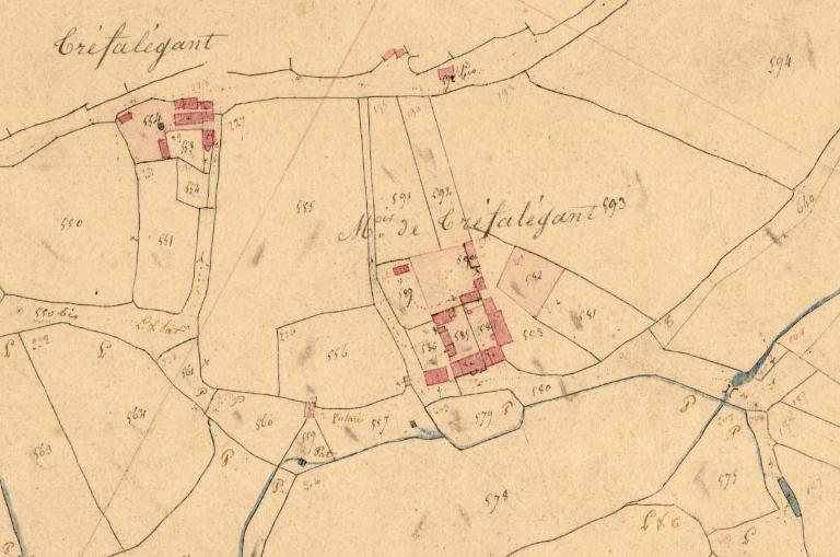 Le logis du premier manoir comportait sans doute deux pièces : une cuisine et une salle ainsi qu'une tour d'escalier en façade nord, comme le montrent deux collages de chaque côté de la porte d'entrée actuelle. La partie contenant la salle s'est effondrée depuis 1978.