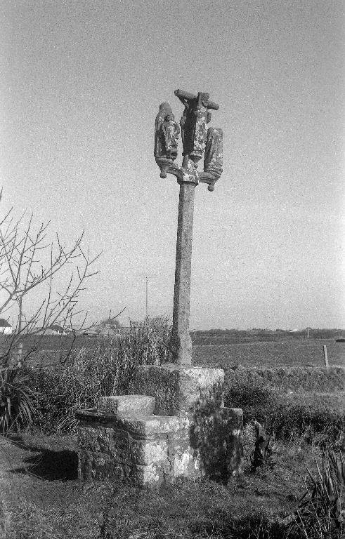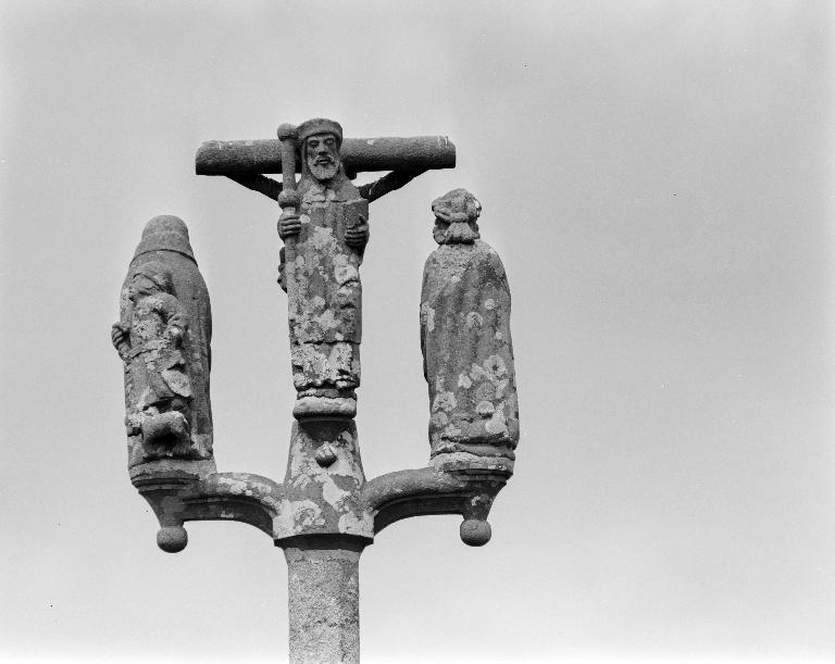 Décor en kersantite, en ronde bosse sur les deux faces. Sur la face principale : Christ en croix, ses pieds posés l'un sur l'autre avec flexion interne du pied droit ; il est encadré de la Vierge et de saint Jean dont la tête a été remplacée par celle d'un Christ couronné d'épines. Sur l'autre face : saint Hervé, au dos du Christ, accompagné de son guide Guiharan qui tient un chien en laisse.