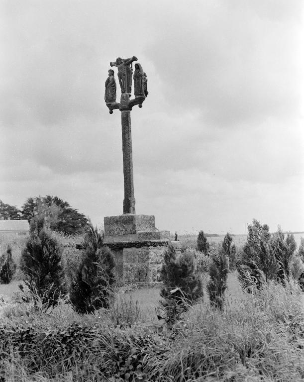 Calvaire de type finistérien sur socle et soubassement formant table d'offrande. En granite : soubassement, socle et fût monolithe de section octogonale à griffes.