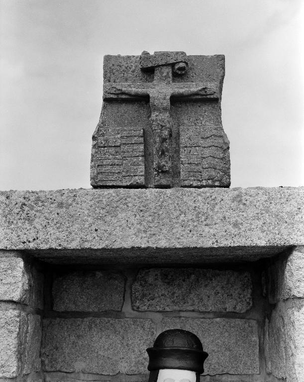2 blasons encadrent le Christ en croix. Les armoiries ne sont pas identifiées.