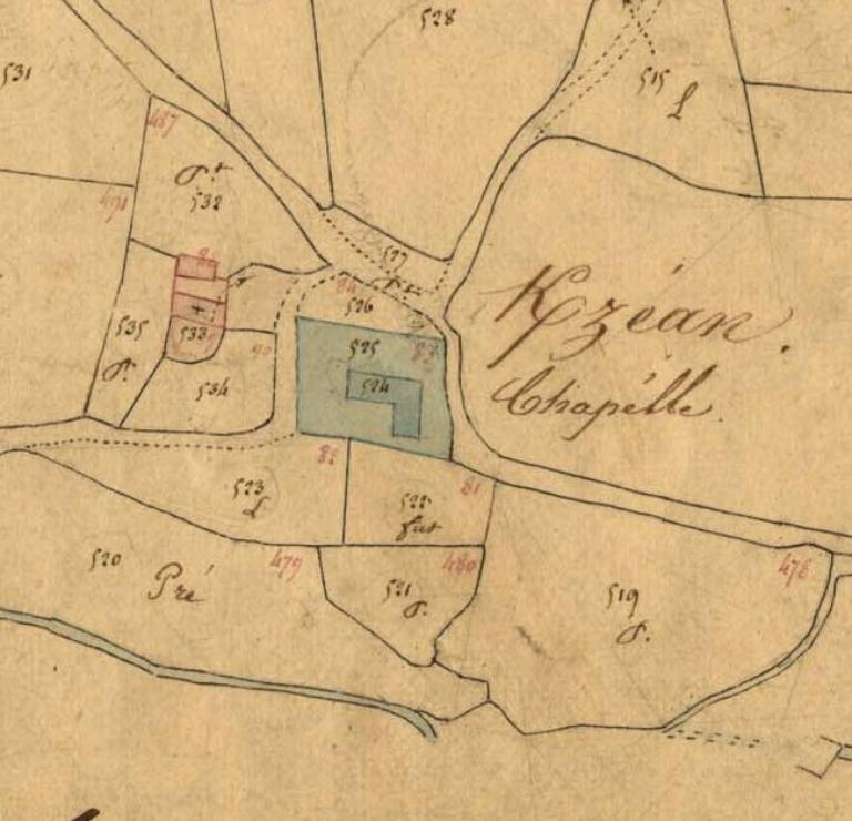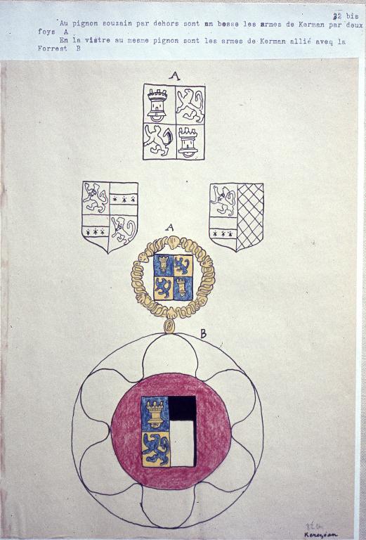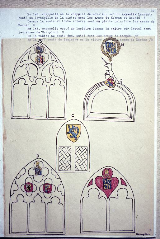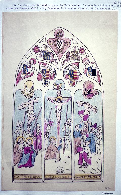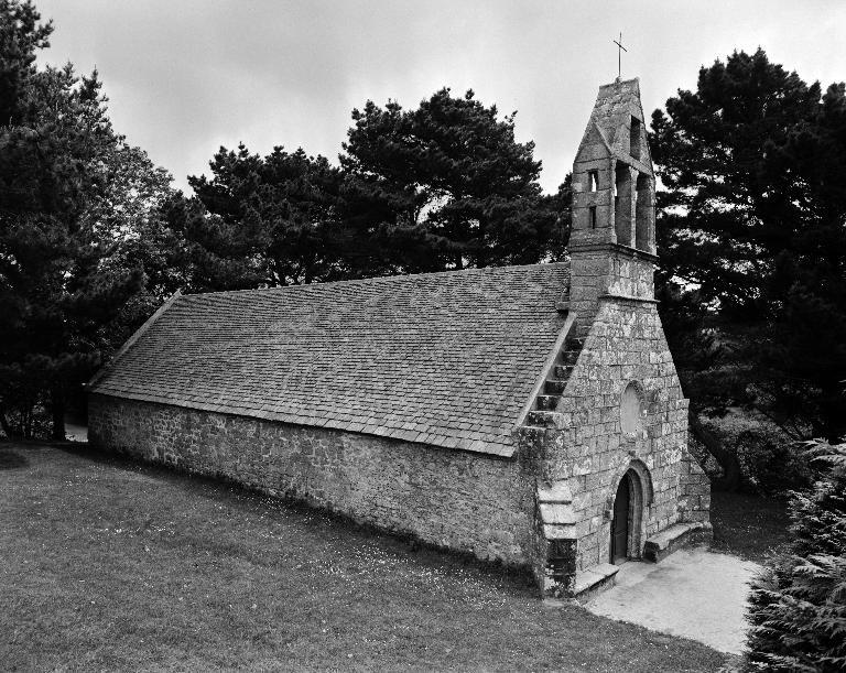La chapelle, construite pendant la première moitié du 15e siècle si l'on en juge par la forme de la porte occidentale, apparaît dans l'inventaire dressé par Jan Bouricquen en 1614, car elle comportait le blason des Carman porté par un ange dans le haut du tympan au-dessus de la maîtresse-vitre. Sur cette dernière figurait la scène de la Crucifixion avec 18 personnages. Au-dessus, l'écu de Bretagne - d'hermine plain - cerné d'une cordelière.