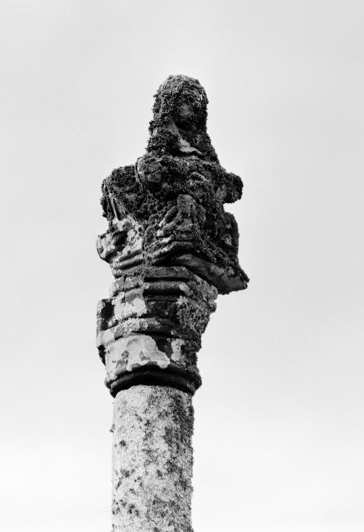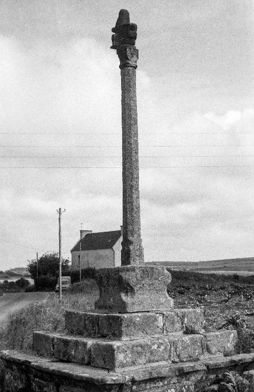 Croix monolithe sur socle cubique à griffes et emmarchement de trois degrés en pierre de taille de granite. Fût de section octogonale à griffes. Décor en relief ; sur une face : Vierge de pitié ; sur l'autre face : ange agenouillé. Le Christ en croix a disparu.