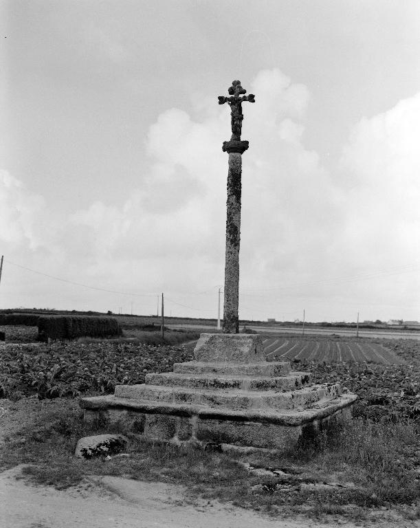 Croix monolithe sur socle cubique à griffes et emmarchement de quatre degrés en pierre de taille de granite. Fût de section octogonale à griffes. La partie supérieure est en kersantite.