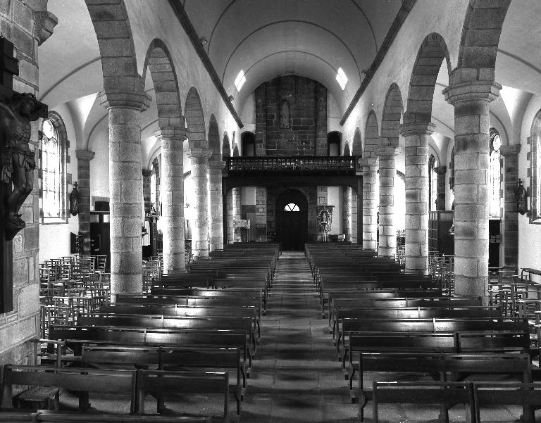 Plan en croix latine à trois vaisseaux. Chevet plat flanqué au sud d´une sacristie de plan rectangulaire et au nord, d´une autre, de plan hexagonal. Porche sud hors œuvre. Clocher à deux galeries et à deux étages de cloches amortis d´une flèche octogonale ajourée ornée de crochets. Gros œuvre en moellon de granite enduit de ciment, à l´exception des encadrements des baies et des chaînages d´angle, en pierre de taille de granite. Nef à sept travées couverte d´un lambris peint en bleu. Arcades en plein-cintre reposant sur les chapiteaux des colonnes. Chœur flanqué de deux chapelles latérales ouvrant sur le transept. Sol couvert de dalles de granite.