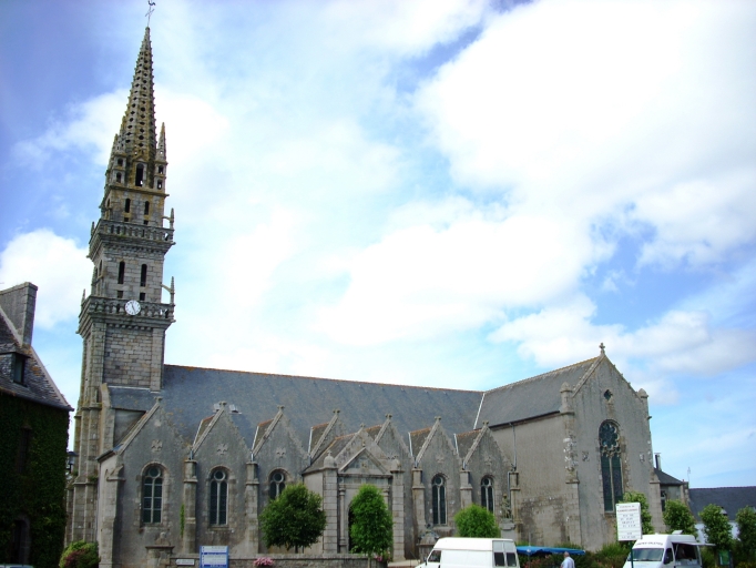 La première église fut bâtie au début du 16e siècle et reconstruite entre 1712 et 1725. Agrandie par Yves Quéré, de Plouescat entre 1744 et 1748, cette deuxième reconstruction s’est achevée entre 1767 et 1769 ; le clocher qui porte ces deux dates et le porche, daté de 1768 ont été conservés, lors de la troisième reconstruction entre 1871 et 1873 par Denis Derrien, sur les plans de Rivoalan, architecte à Brest ; incendiée en 1935, l'église est reconstruite sous la direction de Lionel Heuzé, architecte à Morlaix, et rouverte en 1936 ; le cimetière et l'ossuaire encore présents sur le cadastre de 1837 ont été, l'un déplacé, l'autre détruit.