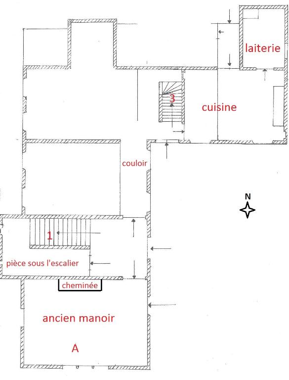 Au rez-de-chaussée, la pièce qui sert de cuisine a été divisée en deux par une cloison ; elle communique avec l’ancienne « laiterie » par une porte cintrée. L’ancienne porte d’entrée sur la façade nord donne actuellement sur des pièces ajoutées au 19e siècle.