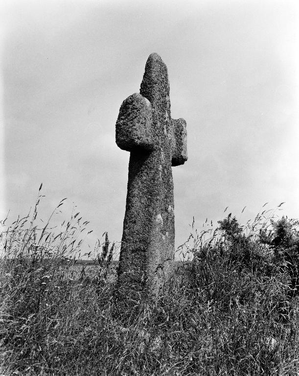 Croix de datation incertaine : moyen âge ? Dressée dans un champ dit Plas Arc'Hezeg, où se tenait le marché aux chevaux de la foire de Lochrist.