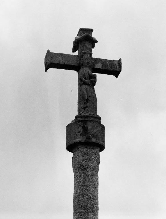 Croix du 15e siècle portant les armes d'alliance des familles Coatgoureden et Le Bihan : mi-parti de gueules à la croix endentée d'argent, mi-parti d'hermines à un quintefeuille de gueules. Le début de la devise des Coatgoureden est encore lisible : " IN CRU [CE SPES ET MUNIMEN] ".