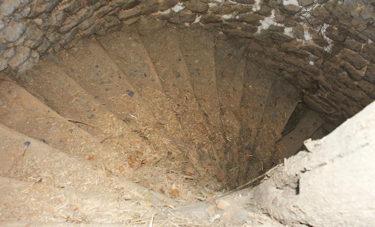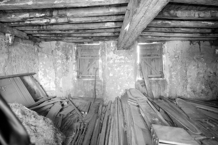 A l'intérieur, le plafond est à poutres et solives apparentes, les cloisons sont en pans de bois. Les sols sont en terre battue dans la partie ouest (cellier) et en ciment dans la partie est (logis). Au rez-de-chaussée, la cheminée située sur le mur est a disparu, sur le mur ouest on voit le culot de maçonnerie portant le foyer de la cheminée de l'étage. L'étage de la partie ouest sert de grenier à foin, tandis qu'à l'est la salle est divisée en deux chambres étroites par une cloison en pan de bois. La cheminée de l'étage est de type adossé à linteau et corbelets en bois qui sont en double quart de rond d'un seul bloc, les piédroits de granite sont en légère saillie à angle abattu ; la hotte est en terre enduite à la chaux. L'escalier à vis menant à l'étage est en bois avec des marches délardées. Un palier communique avec l'étage de l'étable.
