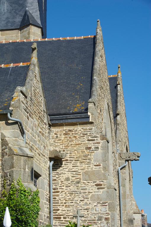 Les éléments intérieurs de l'édifice témoignent également de nombreuses campagnes de travaux. Ainsi, des fonts baptismaux du 15e siècle, composés de cuves doubles, sont surmontés d'un baldaquin de 1715. Au 16e siècle, des vitraux dont il reste d'importants fragments sont posés. La chaire semble dater du début du 18e siècle (recteur Pitteu, commanditaire de l'ancien presbytère en 1728). L'autel-retable du bras sud date du 17e siècle alors que le retable du maitre-autel, datant du 18e siècle, provient de la chapelle des Récollets de Fougères.