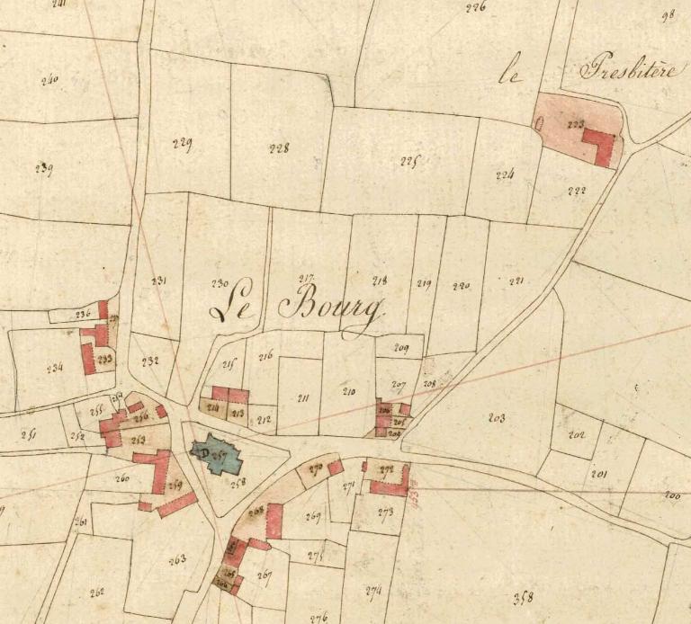 presbytère, quoique peu élevé, n’est pas humide mais assez salubre. La preuve, c’est qu’on vit depuis longtemps pour l’ordinaire… ce qui est fort agréable, c’est qu’il est exempt de toutes servitudes. Il y a un puits, une vaste grange qui lui est accostée, une boulangerie avec four, une étable avec grenier à foin et une retraite à porc, une cour fermée où se trouvent tous les accessoires à distance convenable de la maison principale ; de plus, un jardin et un verger dans lequel se trouve une agréable charmille, le tout clos de haies de buis et d’épines taillées tous les ans. La cour entoure le presbytère au couchant et au nord et contient 13 ares 60 centiares. Le jardin qui est au pignon méridional du presbytère est de 19 ares 40 centiares. Le verger a 23 ares 70 centiares et se trouve au couchant du jardin. On peut dire que le sol de ces deux pièces, ainsi que celui de la cour, est de bonne qualité et très fertile. Le presbytère est assuré et la commune paye la pension du vicaire au moyen d’une imposition extraordinaire».