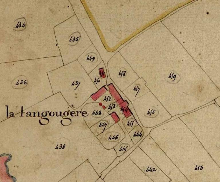 La ferme de la Tangougère est aujourd'hui en ruine, il ne reste que quelques pans de murs à l'ouest de l'alignement où l'on peut voir les ouvertures anciennes ainsi qu'une cheminée. Les éléments encore en place, ainsi que l'étude des photographies prises en 1968 permettent de dater le bâtiment du 17e siècle. Sur les photos on peut voir une fenêtre dont l'appui saillant et le décor de boules au niveau du linteau pourraient même être antérieure c'est-à-dire remonter à la fin du 16e siècle.