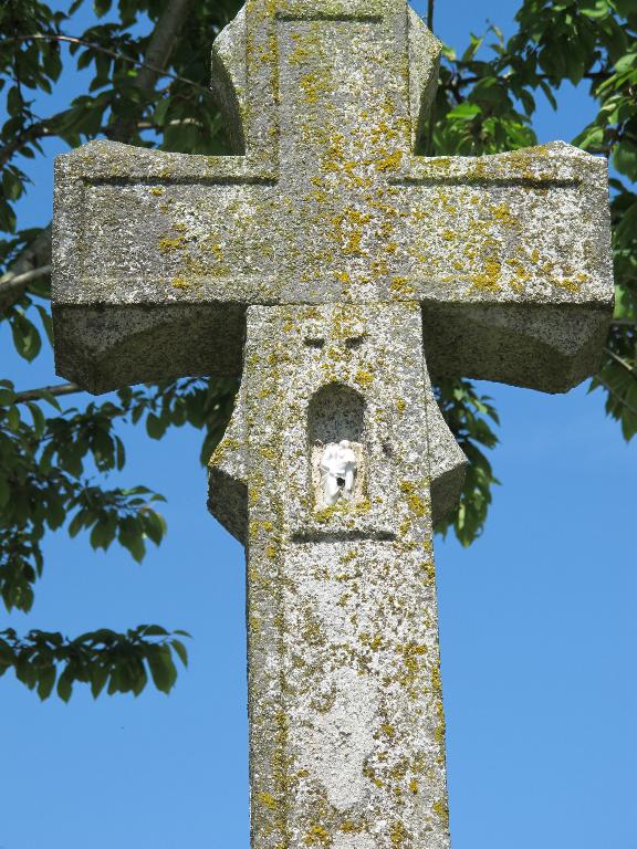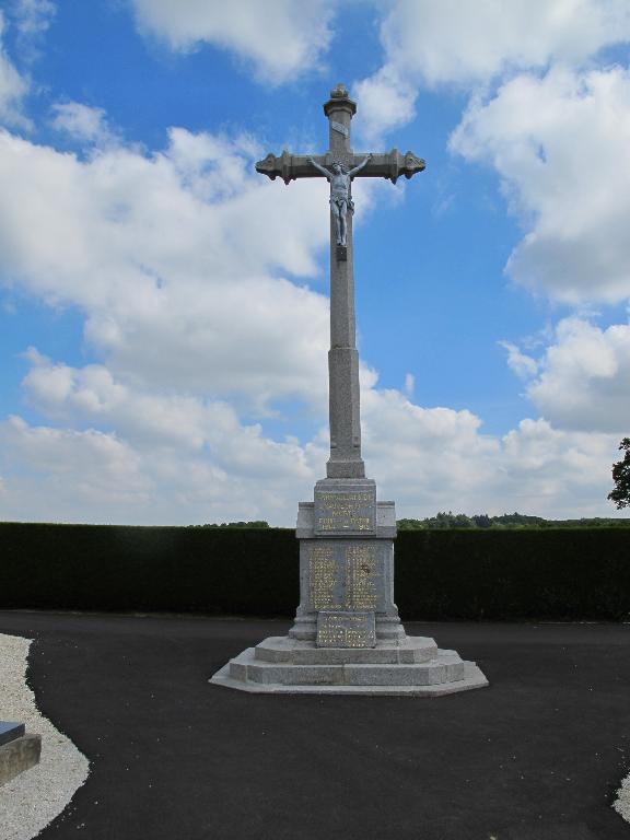 * Place de l’église. Ce crucifix est un monument érigé en l'honneur des soldats morts pour la France lors des deux guerres mondiales. Les branches de la croix sont trilobées. Au-dessus du Christ en croix, on trouve l'inscription "INRI" qui est l'acronyme de "Iesvs Nazarenvs, Rex Ivdæorvm" : Jésus le Nazaréen, roi des juifs.