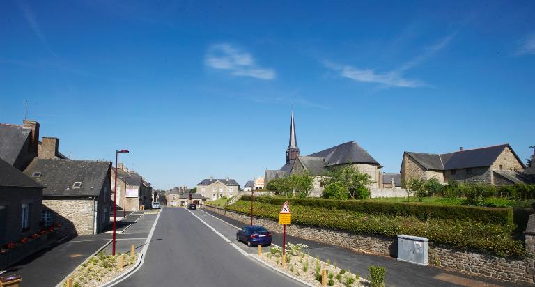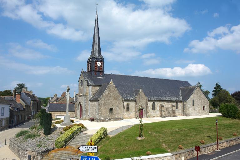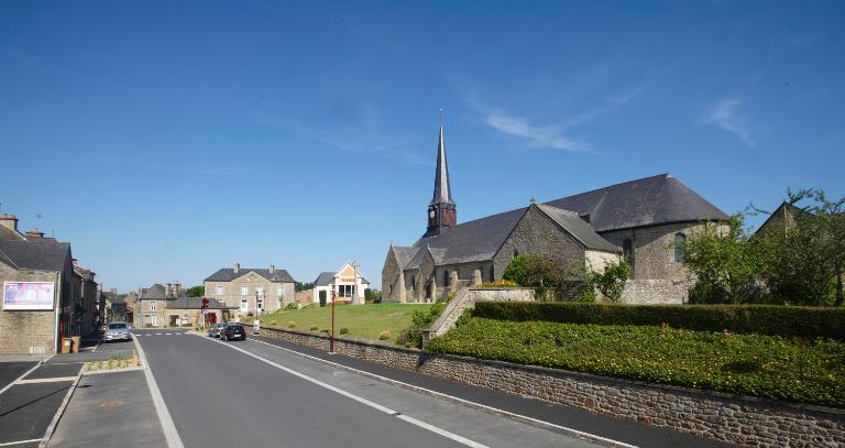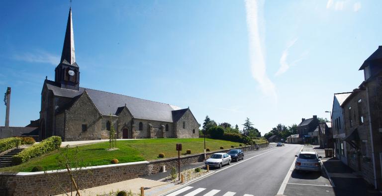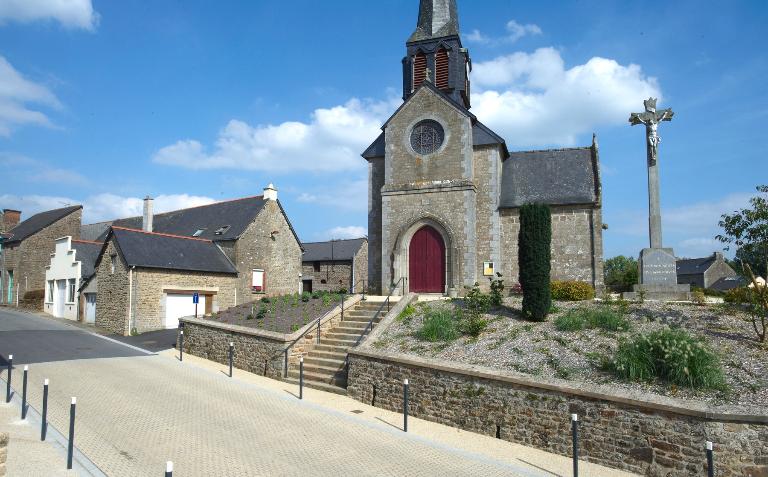 La façade ouest présente un clocher-porche en hors-œuvre, flanqué au sud de la chapelle des fonts. Il y a des traces de reprises à la jonction des deux constructions. Les élévations latérales sont aveugles, et l'élévation ouest a une partie centrale en avant-corps. La façade compte deux niveaux : un grand portail en arc-brisé et oculus, surmonté de la date 1864.