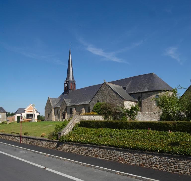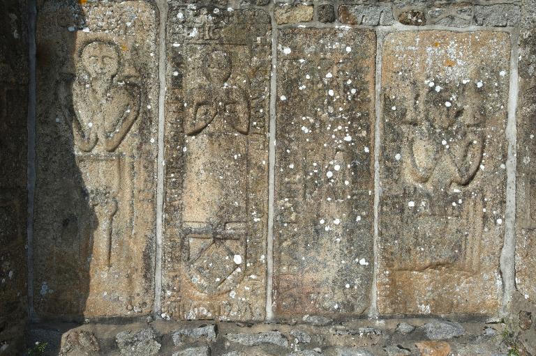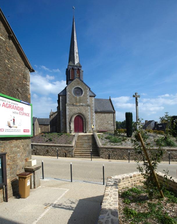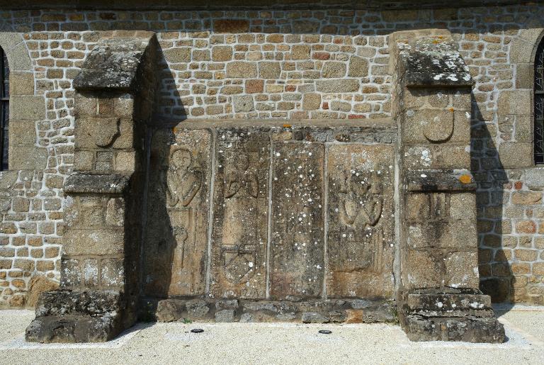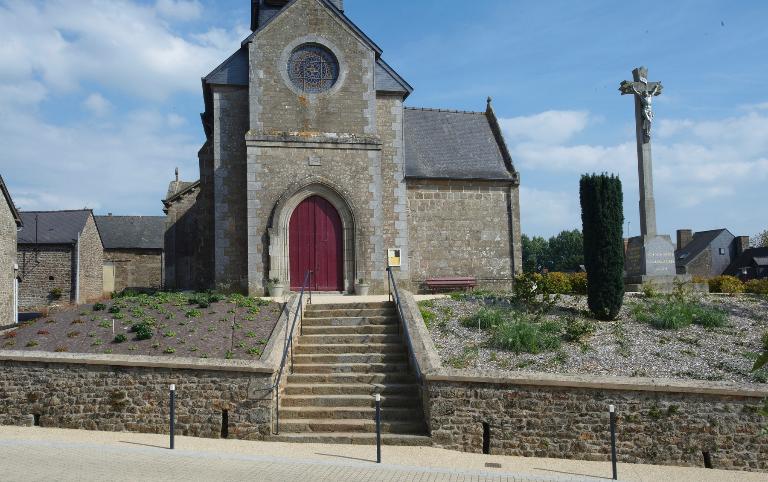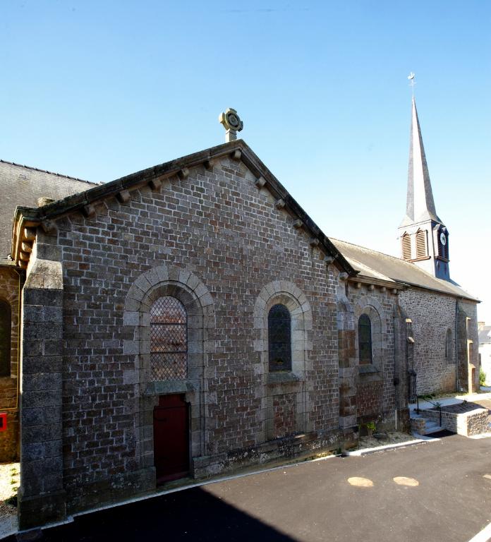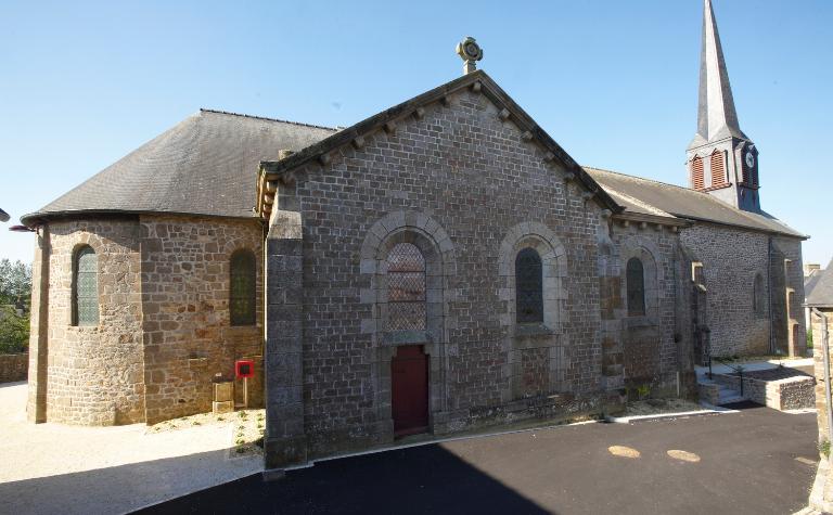 Bras de transept et sacristie : Ces deux constructions séparées par une reprise verticale, sont comprises sous le même toit. Le mur ouest, oblique et aveugle, remploie des pierres tombales. Le mur-pignon sud est sommé d'une croix monolithe, ajouré dans l'axe du bras de transept d'une petite fenêtre trilobée, et dans l'axe de la sacristie d'une fenêtre rectangulaire.