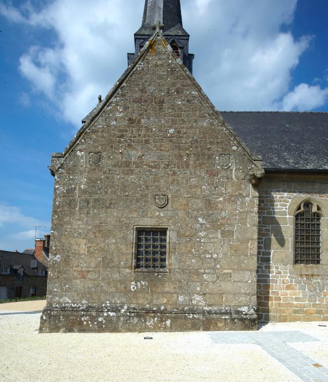 Chapelle des Fonts : son mur pignon sud comprend une plinthe et des rampants moulurés et sommés d'une croix, sous la pierre d'assise Est. Une gargouille en ronde-bosse, figure un félin. La fenêtre axiale rectangulaire possède un encadrement mouluré d'un cavet et d'un tore (linteau, piédroits et appui). Le mur porte trois blasons. Son mur-gouttereau ouest est aveugle.