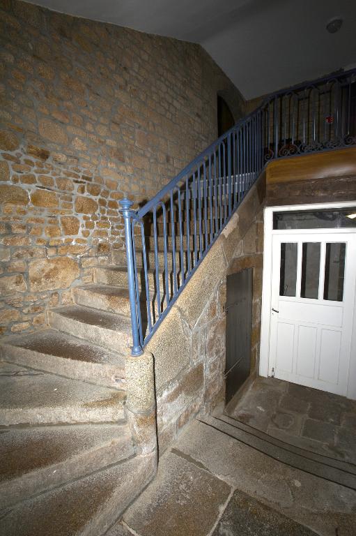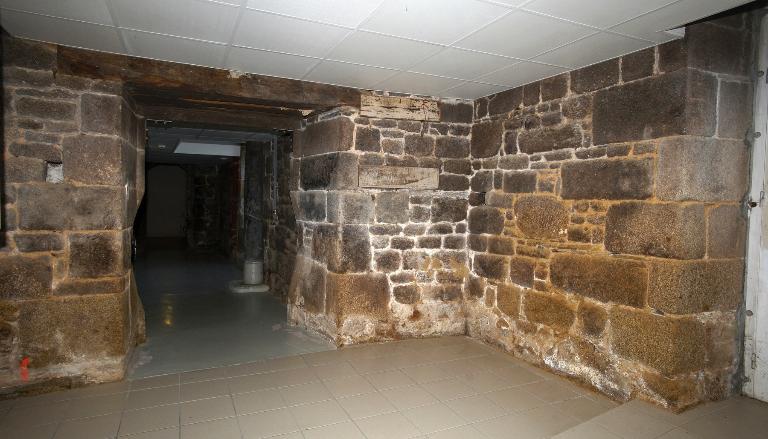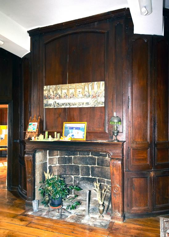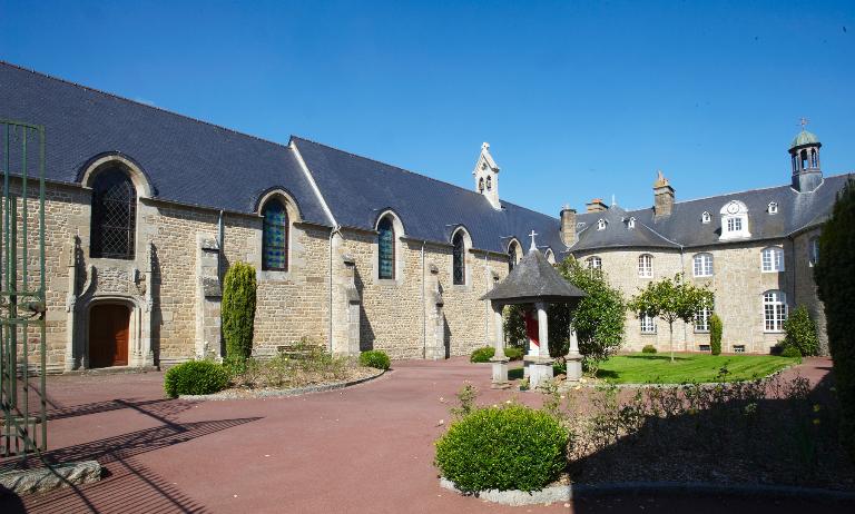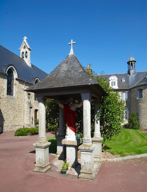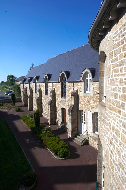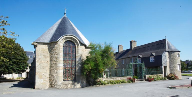 On lisait sur la seconde : "çy gît Victoire Mouessan de la Villirouet, Ctesse Henry de la Haye-Saint-Hilaire, fondatrice de l'hospice de Chaudeboeuf, décédée à Rennes le 28 septembre 1869 ; priez Dieu pour elle. On voyait aussi des débris d'un monument élevé en l'honneur d'un chanoine issu de la famille Le Lièvre et mort en 1704. A l'origine, la chapelle, dédiée à Saint-Joseph, était indépendante de l'habitation principale. Elle est prolongée en 1932 par une nouvelle nef plus vaste qui la rattache au château, pour accueillir la population croissante. Il subsiste de la construction du 18e siècle le chœur et la sacristie de la chapelle. Dans cette partie, une porte plus ancienne est remployée : il s'agit d'une porte en accolade surmontée d'un gâble, probablement du 16e siècle, qui est ornée des armoiries visibles de la famille Pinel, fondateurs de l'église et premiers propriétaires des terres de l'ancien manoir, jusqu'en 1650.