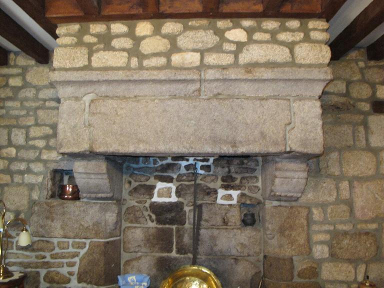 La cheminée a un visage gravé sur chaque piédroit. Sa hotte est droite. Le linteau est monolithe à crossettes avec un décor de torsade. Les piédroits sont chanfreinés avec un décor de tête humaine.