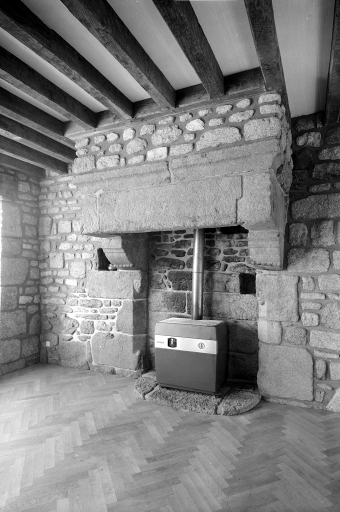Intérieur : Plafond avec poutres apparentes. Cheminée de granite avec des consoles ornées d'un cordon et de têtes en haut des piédroits, pris dans le mur. Sol en ciment. Porte bouchée (pignon est). Escalier tournant en granite montant à l'étage. Noyau de granite."