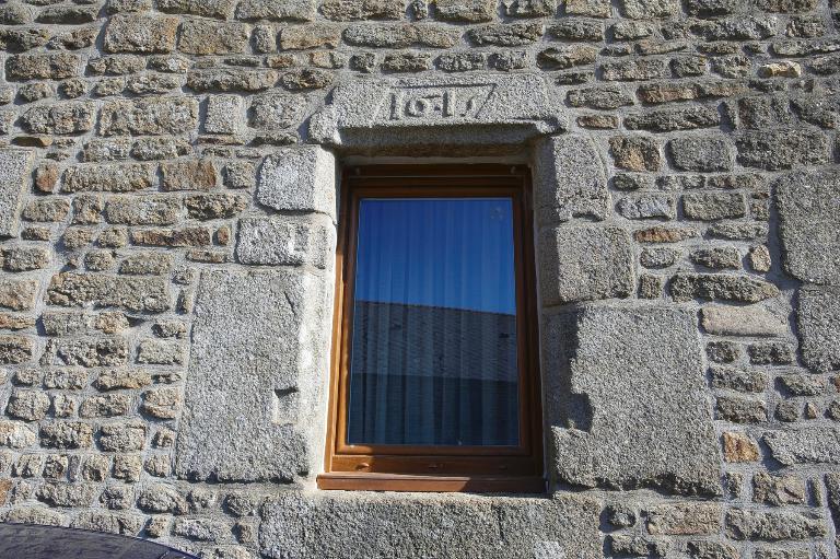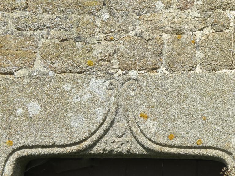 - La cheminée 2 est située au rez-de-chaussée dans la cuisine sur le pignon est. Elle est en granite de type engagé. Son linteau est à crossettes et sa corniche est moulurée (cavet, quarts de rond, bandeau). Les consoles et les piédroits sont décorés de gorges verticales. Le foyer est en granite. La largeur de la cheminée est de 2.20m. Cette cheminée provient de la maison datée 1587, le déplacement a été effectué en 1948.