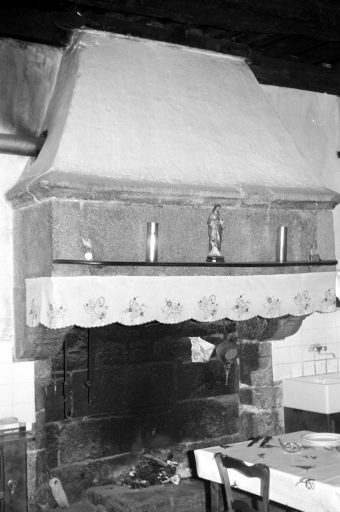 La cheminée 1 (photos 9-10) est située au rez-de-chaussée sur le pignon Est. Elle est affleurée, en grand appareil de granite. Les piédroits appareillés sont ornés d'une demi-colonne avec tore axial, base et amortissement sur plan carré mouluré de tores ; la console importante est moulurée d'une gorge et d'un large quart-de-rond ; le linteau est monolithe à crossettes, frappé en son centre d'un écu muet. La hotte est droite en grand appareil de granite.