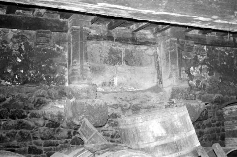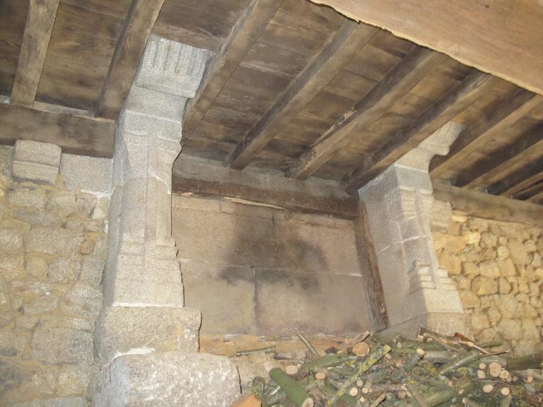 La cheminée 4 (photos 14-15) est située à l'étage, mur de refend côté ouest. Elle est adossée, ses piédroits appareillés sont ornés d'une demi-colonne flanquée de tores. Les consoles sont peu développées mais moulurées de tores et cavet. Le linteau monolithe est à crossettes, la hotte a disparu. La largeur de la cheminée est de 160 cm.