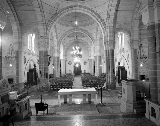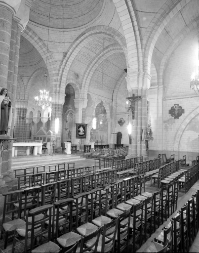 L'ancienne église était en partie romane (nef, abside en cul de four, tour) et avait été agrandie d'un transept en 1615. L'abside fut démolie en 1778 et les vases accoustiques ont été conservés au Musée de Bretagne. L'église actuelle non orientée a été construite en 1895 sur les plans de l'architecte Henri Mellet, dans un style néo-roman poitevin.