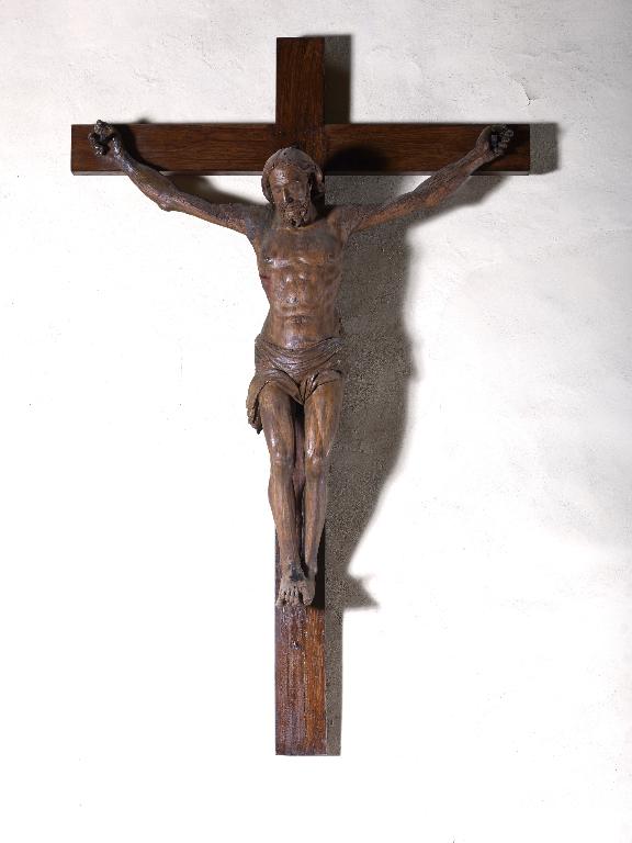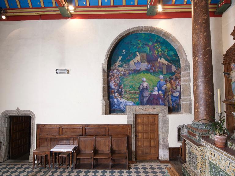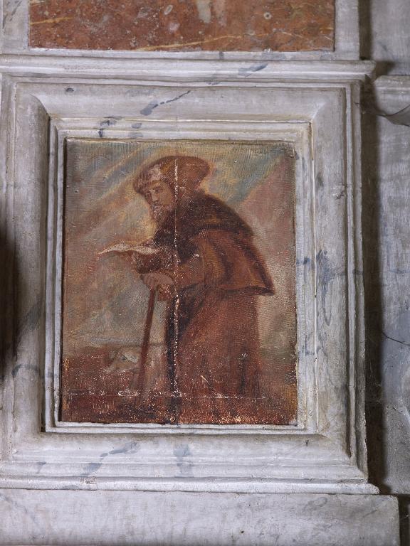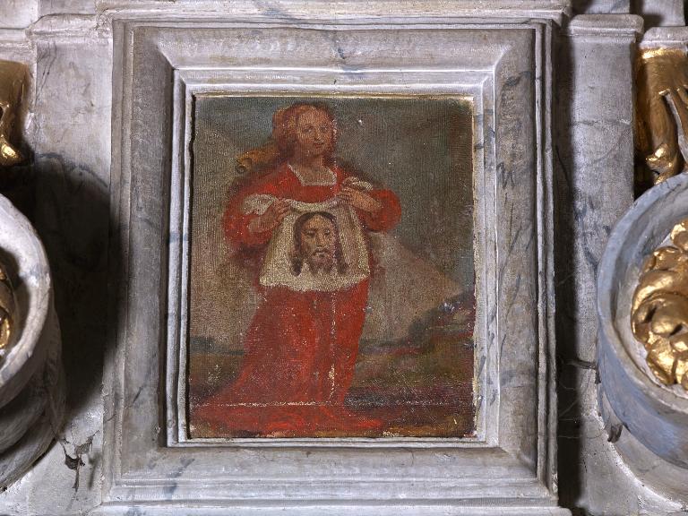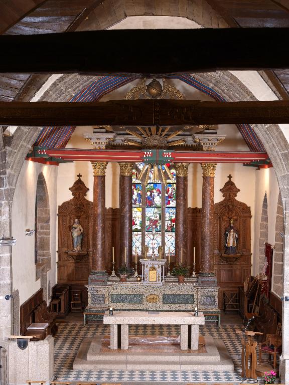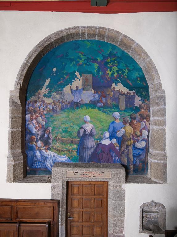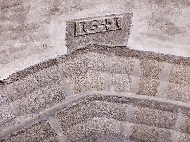 Sujet : instruments de la Passion avec coeur, support : porte du transept sud ; sujet : animal fantastique, support : acrotères et engoulants de la charpente ; sujet : armoiries des lys, de gueules à la fasce d'argent, chargée de 4 hermines de sable et surmontée de 2 fleurs de lys d'argent, support : piles de la croisée du transept.