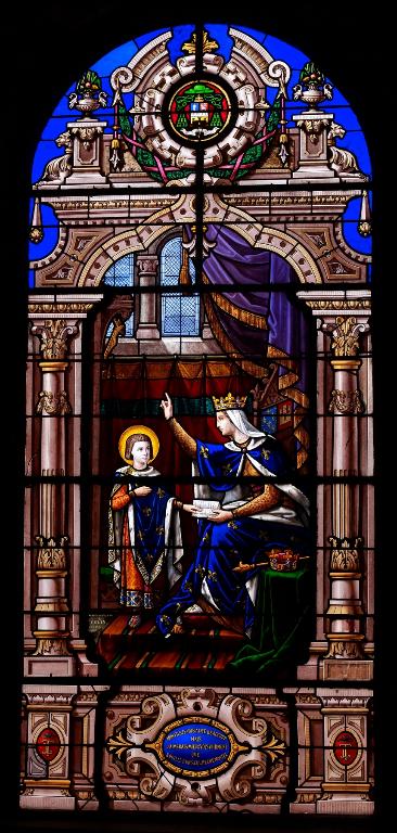 Le vitrail représentant Blanche de Castille enseignant à son fils saint Louis fut réalisé par l'atelier Lecomte et Colin. La partie centrale du vitrail, de couleurs plus foncées, met en valeur la scène par rapport à la représentation architecturale dans les tons jaune clair qui l'entoure. Ce vitrail appartient à un ensemble plus vaste de vitraux classés, réunissant les verrières du chœur et les grisailles de la nef.