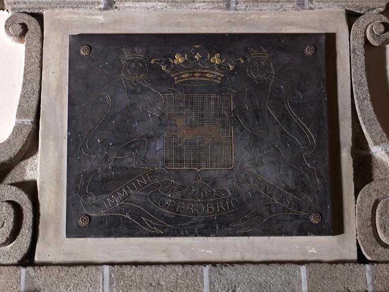 Le toit repose sur une corniche composée de petits modillons en pierre et d'un aspect assez agréable ; au-dessous on remarque une série de pierres de tuffeau engagées dans la muraille et sans doute destinées à recevoir des écussons aujourd'hui disparus.