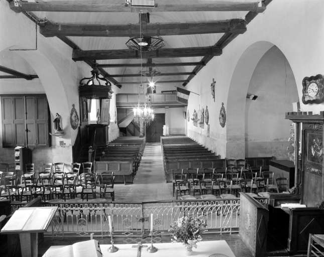 Plan en croix latine, charpente en bois apparente et lambris de couvrement, clocher-porche a remplacé l'ancien clocher situé en haut de nef, porche latéral, chevet plat.