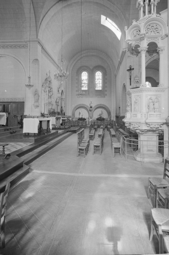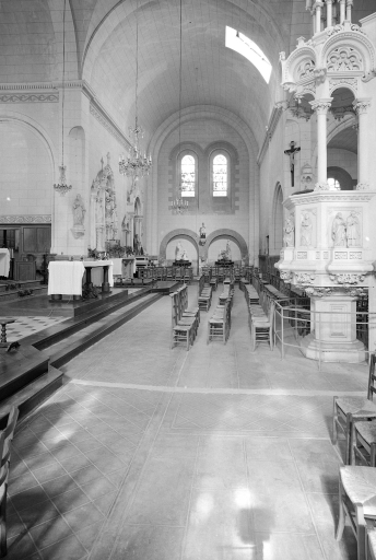 Plan en croix latine, voûte en berceau en anse de panier, façade latérale à pignons multiples, façade principale encadrée de deux tours avec campaniles sommés de flèches, chevet à pans coupés, style néo-roman.