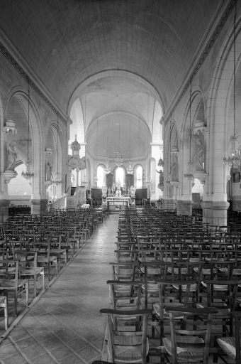 L'ancienne église située au coeur de l'agglomération, place Saint-Martin détruite vers 1850, avait son choeur séparé de la nef par un arc triomphal accosté de deux autels. La nef était flanquée de quatre chapelles, l'une d'elles était aux seigneurs de la Marzelière et passa en 1677 à ceux de la Praye. L'église actuelle construite au sud-ouest du bourg est l'oeuvre de Léoce Couetoux architecte départemental en 1851 (date et attribution par source) . En 1876, l'église étant déjà considérée trop petite, un projet de reconstruction partielle est dessiné par Arthur Regnault, les travaux sont réalisés en 1892 (?) (date du devis récapitulatif des travaux et dépenses) . Ensemble de verrières de la 2e moitié du 19e siècle par l'atelier Rault et l'atelier du Carmel du Mans.