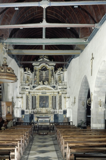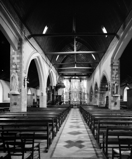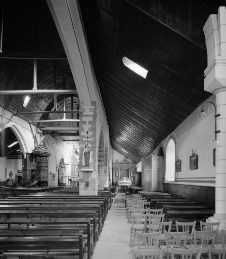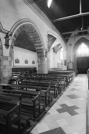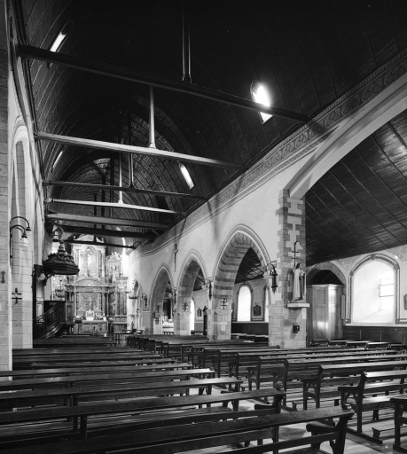 Plan allongé avec charpente en bois apparente et lambris de couvrement, clocher-porche en façade, porche latéral sud, chevet arrondi.