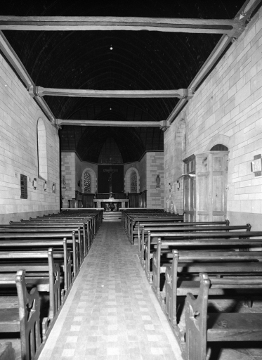 Plan en croix latine, lambris de couvrement, clocher en façade, chevet à pans coupés.