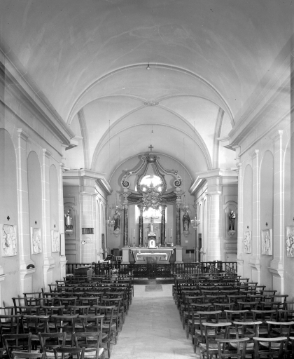 Plan en croix latine, clocher-porche recouvert d'une flèche polygonale en ardoise, chevet plat.