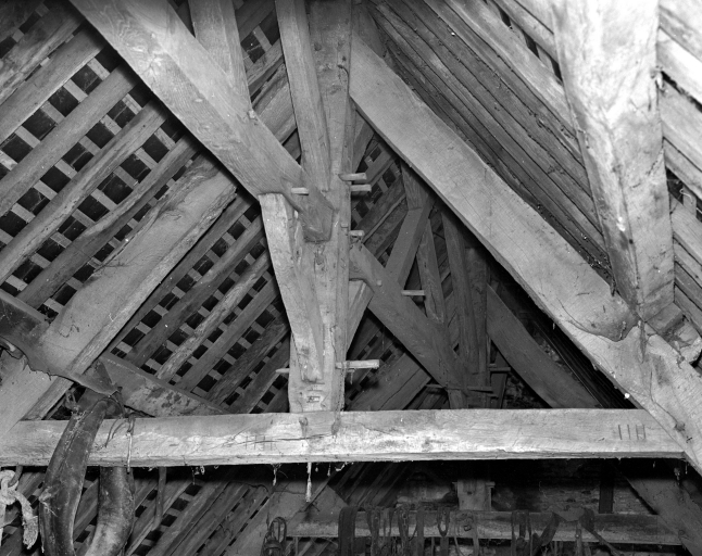 Le toit est à long pans à croupe et possède trois petites lucarnes sur le versant est ainsi que deux souches de cheminées. La charpentes est à six fermes portant pannes (arbalétriers, poinçon, entrait retroussé, croix de saint André et aisseliers).