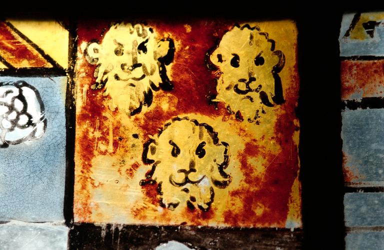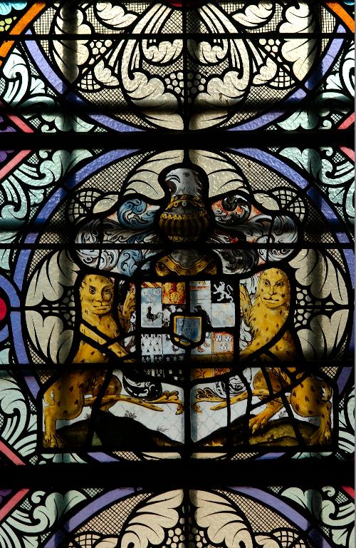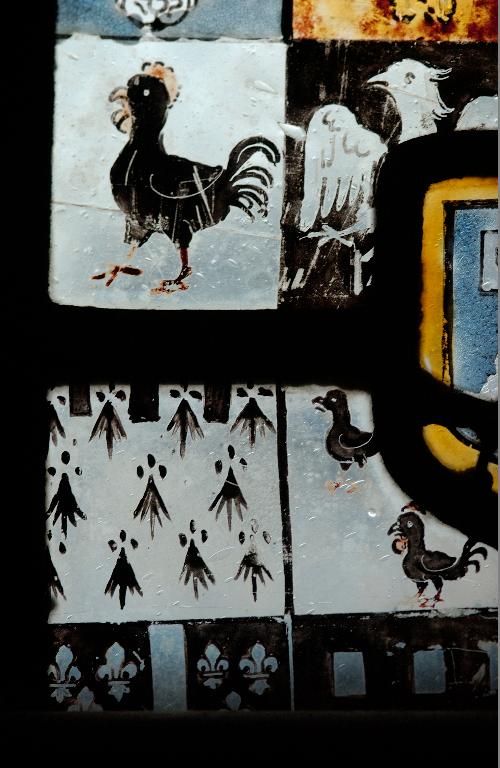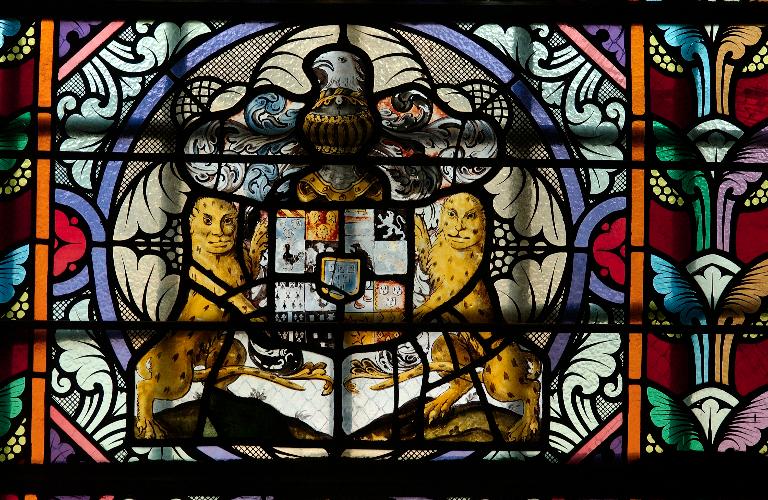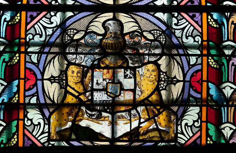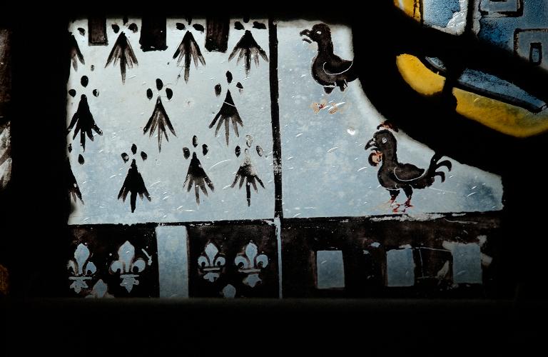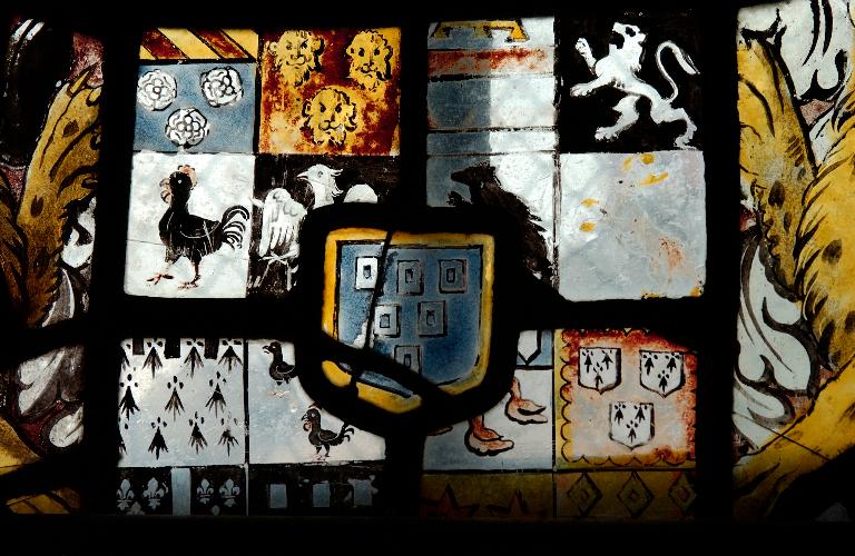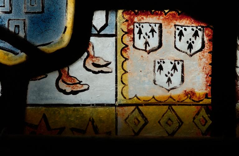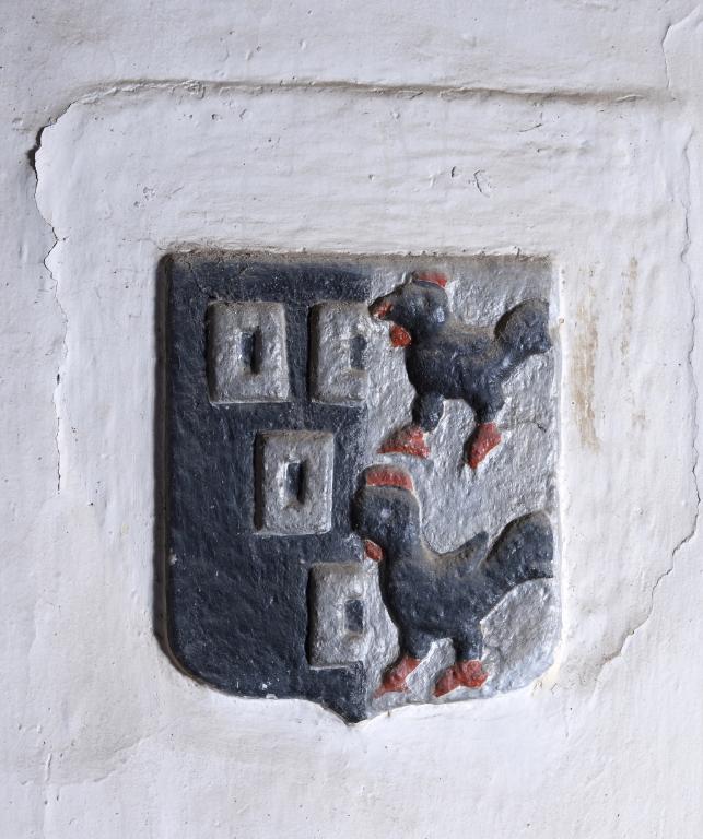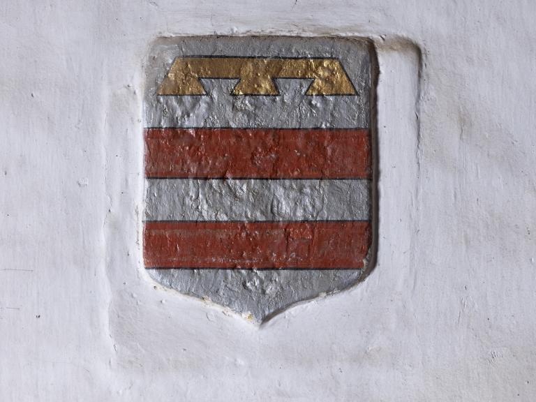 De nombreux écus peints ou gravés aux armes de la famille Huchet et de ses alliés sont visibles dans l'édifice. Les murs nord et sud de la nef conservent les écus bûchés d'une ancienne litre seigneuriale.