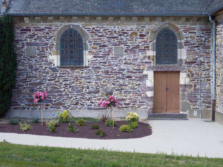 A l'extérieur, au niveau l'entrée de la chapelle sud se trouve une pierre tombale en schiste portant l'inscription Yves, et décorée des armes des le Vayer.