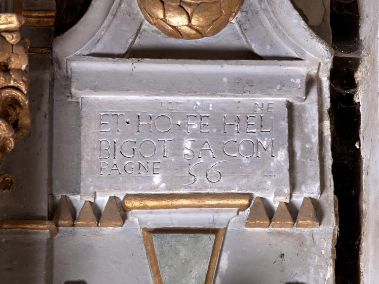 Le chœur communique avec la chapelle sud par un arc surbaissé sur lequel est visible les armoiries de la famille Huchet, et dont l'un des supports présente une inscription portant la date de 1641.