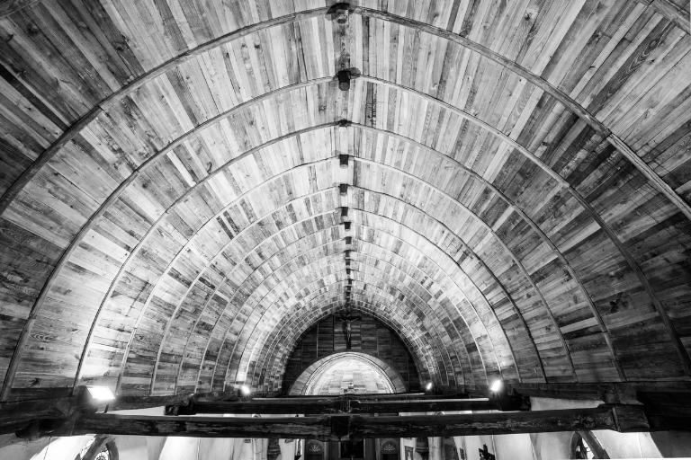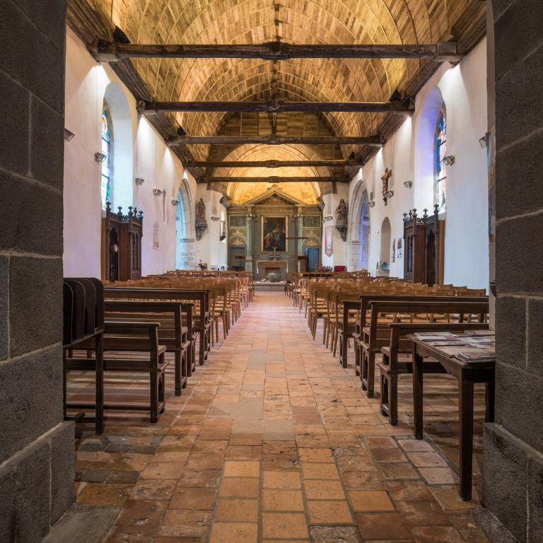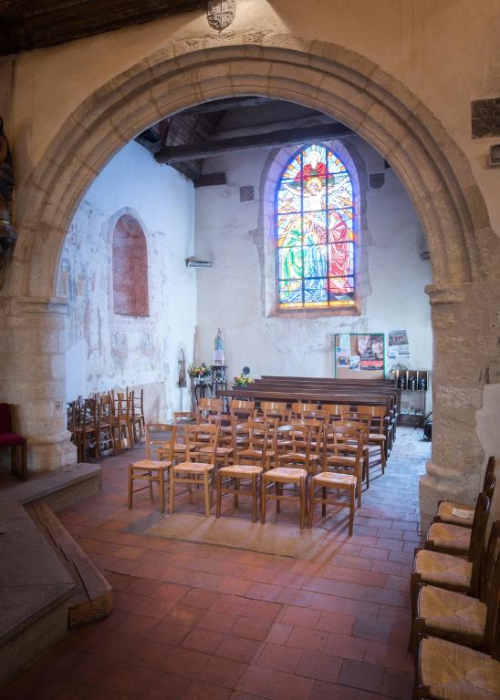 Entre le chœur et le clocher-porche une nef possédant une voûte lambrissée en chêne en plein cintre ainsi qu'un transept se déploient. Les bras de ce dernier accueillent tous deux une chapelle qui ouvre sur la nef au moyen d'une arcade en plein cintre. La chapelle sud a conservé sur son mur Est une crédence à arc ogival. Sur ce même mur on peut observer des peintures murales qui se déploient autour d'une large niche peinte en rouge (elle se trouve à l'emplacement d'une baie qu'elle est venue boucher).