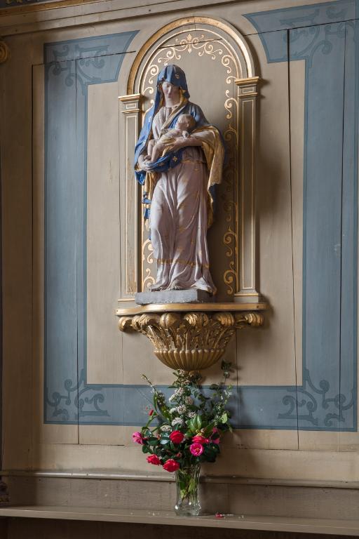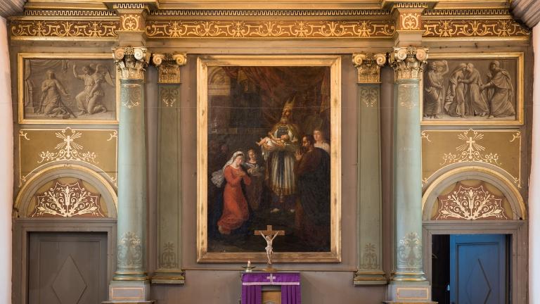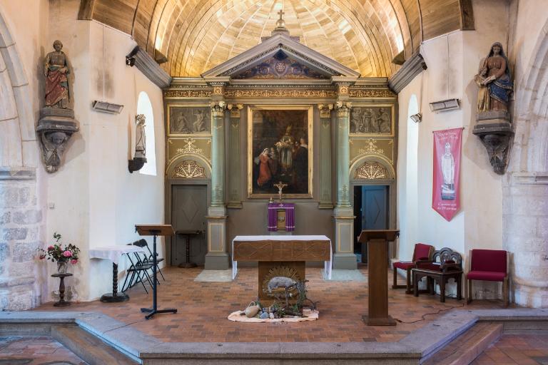 Le second, le néo-classique, se retrouve essentiellement au niveau du retable, dans le choeur, dans lequel on constate la présence du tableau d'Antoine Logerot La présentation de Jésus au temple réalisé en 1828 est inscrit entre deux pilastres eux mêmes présentés entre deux colonnes à fût monolithe d'ordre composite. Ce tableau est encadré par deux toiles imitant les bas-reliefs : celle du nord représente l'Annonciation et celle du sud la Visitation. Au-dessus de ces décors se déploient une frise puis une corniche et enfin un fronton triangulaire. Le tout est baigné dans la couleur or.