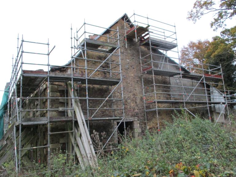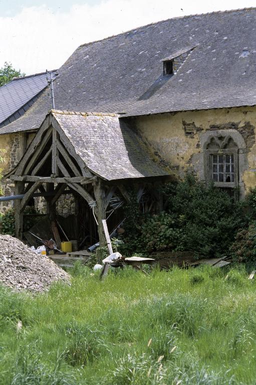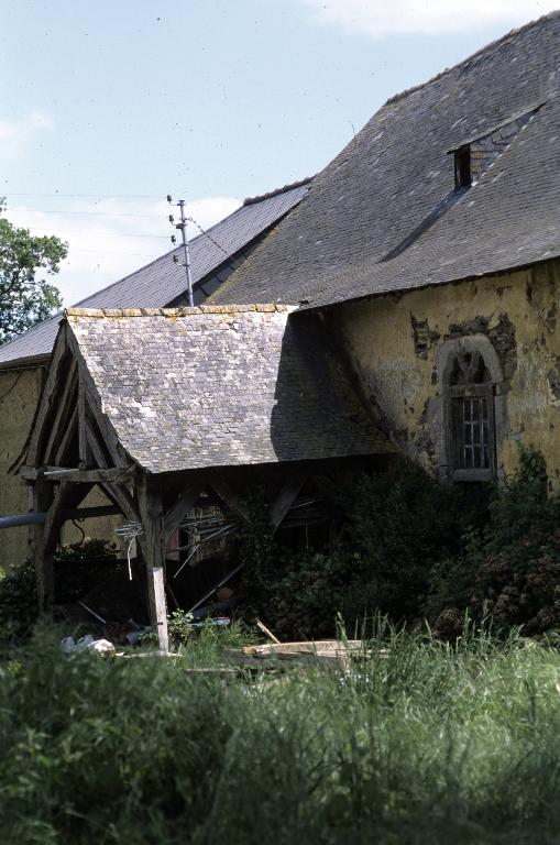 Ancien logis construit du 14e au 16e siècle. Précédé d'un porche rare en charpente, du 16e ou 17e siècle, pavillon sur façade arrière détruit. (1986, Service régional de l'Inventaire de Bretagne)
