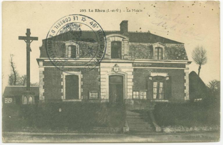 Mairie construite sous le Second Empire vers 1860 (armoiries à l'aigle impériale surmontée d'une couronne fermée, sur l'arc de la porte d'entrée). En 1858 la municipalité du Rheu décide de construire un édifice dédié à l’usage de maison commune. En effet les réunions du conseil municipal se tenaient jusqu'alors dans la sacristie de l’église paroissiale ou au domicile du maire. Le nouvel édifice devait comprendre une mairie, une classe pour l’école et un logement pour l’instituteur. Le projet est confié à l'architecte rennais Louis-Auguste Le Ray (1814-v. 1878). Achevé en 1860, le bâtiment accueille le premir conseil municipal l’année suivante.
