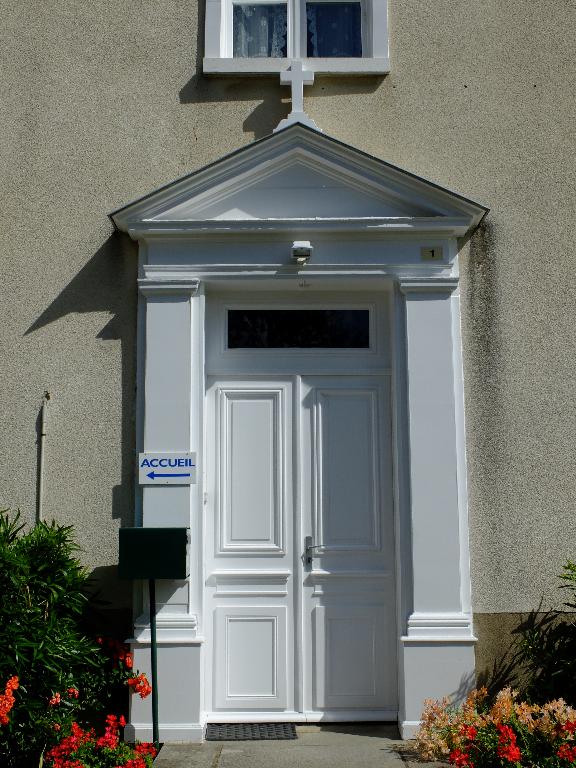 La façade principale, orientée au sud, est ordonnancée en cinq travées régulières couronnées sur le versant du toit par de petites lucarnes à croupes. La porte d'entrée positionnée sur la travée centrale est encadrée par deux pilastres en bois surmontés d'un fronton triangulaire.