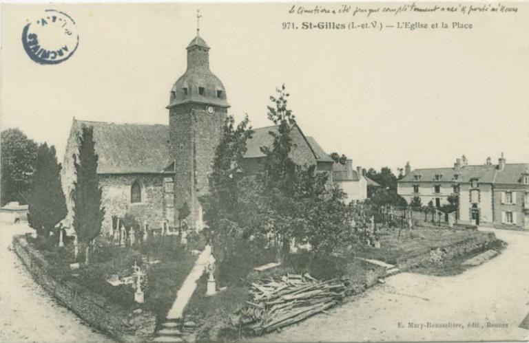L'abbaye Saint-Melaine de Rennes possédait un prieuré à Saint-Gilles en 1152. L'église a été reconstruite dans la 2ème moitié du 15e siècle (sablières de la nef étaient datées 1487) . Le chœur et le transept sont refaits sous la direction de l'architecte Lagarde (ou de Lagarde) en 1837. Le clocher-porche de la limite du 18e siècle 19e siècle est achevé vers 1846 (date de demande de subvention pour la reconstruction de la porte principale) . Croix de cimetière de 1409 (date portée avec inscription).