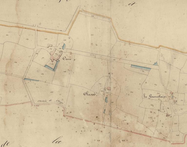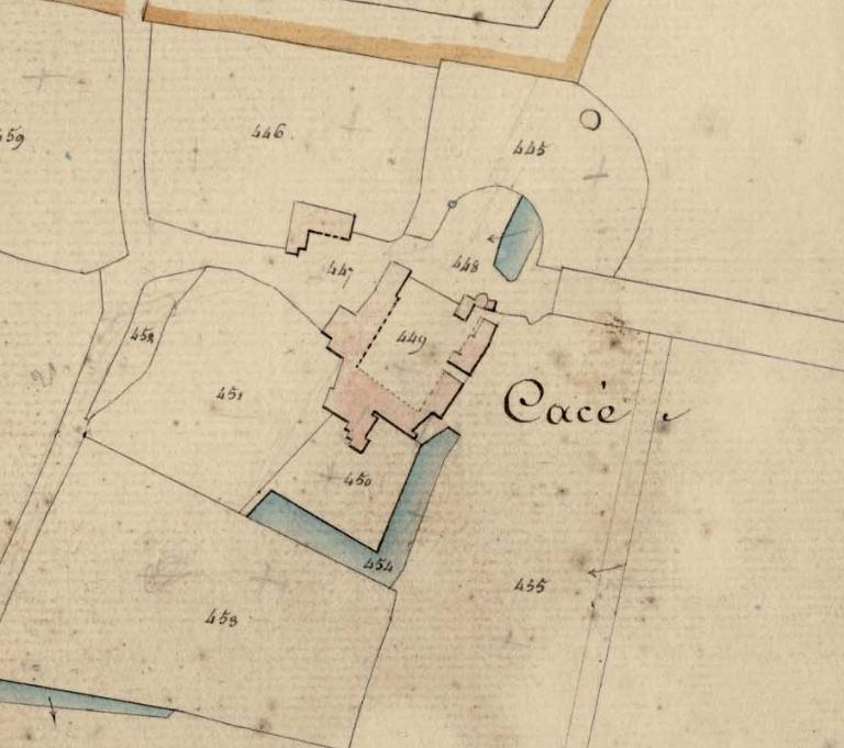 Cacé présente de nombreuses similitudes avec le manoir de La Porte à Saint-Gilles, ancien logis seigneurial également du 15e siècle et dont la façade principale est orientée au nord, faisant face à aux talus, toujours en place, de la motte castrale. Il n'y a pas de motte castrale attestée par sources écrites à Cacé, cependant la forme circulaire à quelques mètres au nord du logis principal, plantée d'arbres, peut y faire penser.