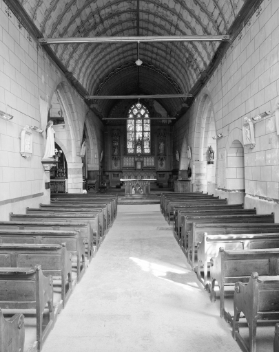 Plan en croix latine, lambris de couvrement, clocher latéral, chevet plat.