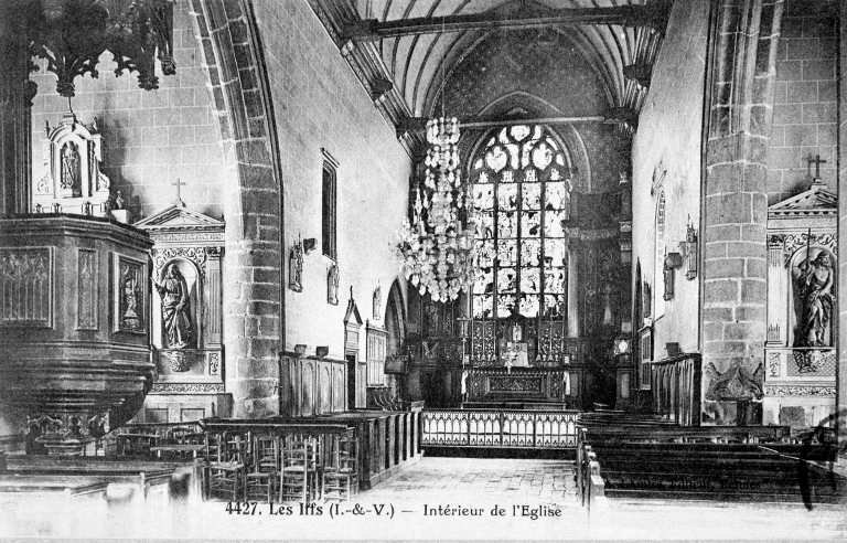 Saint-Ouen des Iffs tout comme sa voisine, Saint-Brieuc-des-Iffs, est un démembrement de l’ancienne paroisse primitive de Tinténiac. Le déplacement du site castral originel, de l’ancien bourg de Tinténiac sur l’éperon de Montmuran vers la fin du XIIe siècle, et le succès d’un pèlerinage associé à la fontaine proche de Saint Fiacre ont joué un rôle important dans le destin de l’église des Iffs. La seigneurie de Tinténiac-Montmuran est transmise au cours du XIVe siècle dans la maison de Laval-Montmorency-Vitré, qui s’allie au cours du XVe siècle avec la famille ducale de Bretagne par le mariage de Guy XIV de Laval-Montmorency, seigneur de Montmuran, avec Isabelle de Bretagne, fille de Jean V. Cette alliance prestigieuse est sans doute à l’origine de la reconstruction de l’église des Iffs entreprise au cours de la première moitié du XVe siècle, en même temps que celle du château.